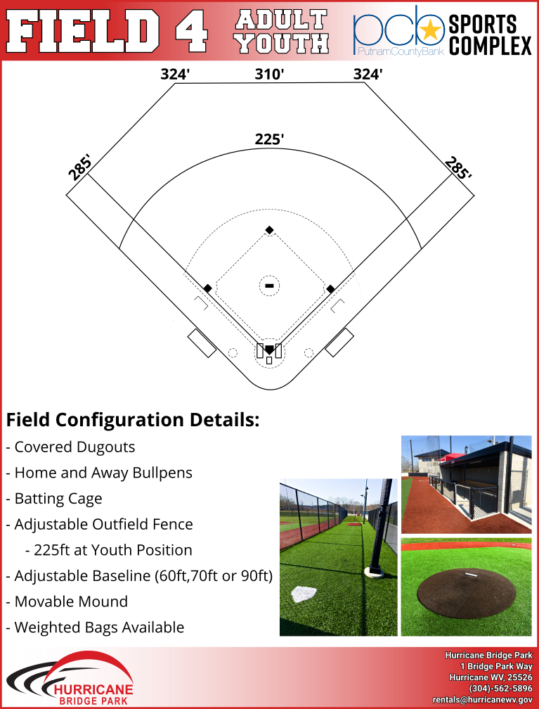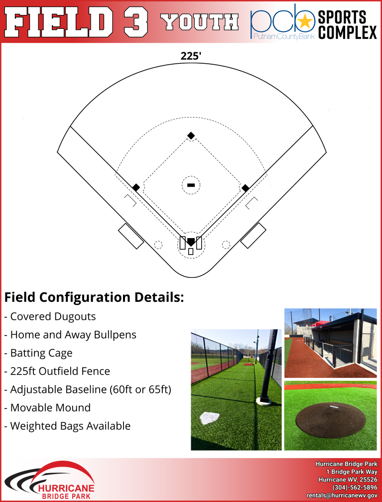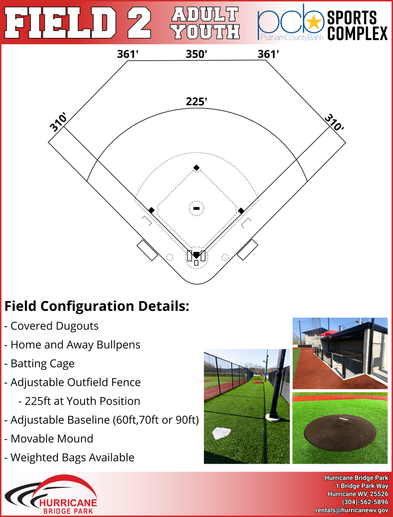 The Putnam County Bank Sports Complex at Hurricane Bridge Park is located on the upper level of Hurricane Bridge Park, accessible via a street called Bridge Park Way located beside the main parking lot of First Baptist Church of Hurricane (which is 2635 Main Street). The Putnam County Bank Sports Complex features four tournament-ready baseball fields with in-ground dugouts, movable fencing, MUSCO LED lighting, bullpens and more. The complex is fully furnished with a press box, concession stand and bathrooms.