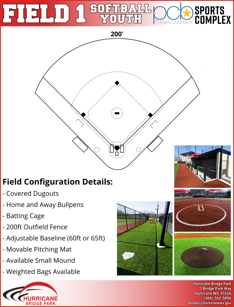 The Putnam County Bank Sports Complex at Hurricane Bridge Park is located on the upper level of Hurricane Bridge Park, accessible via a street called Bridge Park Way located beside the main parking lot of First Baptist Church of Hurricane (which is 2635 Main Street). The Putnam County Bank Sports Complex features four tournament-ready baseball fields with in-ground dugouts, movable fencing, MUSCO LED lighting, bullpens and more. The complex is fully furnished with a press box, concession stand and bathrooms.